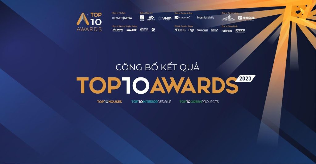 | Top 10 Awards – Giải thưởng thường niên tôn vinh các tác giả, tác phẩm tiêu biểu nhằm nêu bật giá trị Thẩm mỹ, Sáng tạo, thúc đẩy sự phát triển của ngành thiết kế Kiến trúc – Nội thất nói riêng tại Việt Nam, ngành công nghiệp văn hóa và sáng tạo Việt Nam nói chung. Top 10 Awards do KIENVIET MEDIA tổ chức từ năm 2018 dưới sự bảo trợ của Hội Kiến trúc sư Việt Nam. Năm 2021, Giải thưởng mở rộng quy mô với 2 hạng mục lớn: Top 10 House Awards & Top 10 Interior Design Awards.Bước sang năm thứ 6, tiếp nối hành trình mang đến những giá trị tốt đẹp cho xã hội và con người, Ban tổ chức tiếp tục mở rộng thêm hạng mục thứ 3: Top 10 Green Project Awards nhằm thúc đẩy các ý tưởng, khái niệm thiết kế xanh và bền vững. Cách thức tham dự: gửi trực tiếp qua email: top10awards@kienviet.net, tiêu đề ghi rõ:- “Hồ sơ tham dự Top 10 Green Project Awards 2023” (đối với bài dự thi Hạng mục công trình xanh) – “Hồ sơ tham dự Top 10 House Awards 2023” (đối với bài dự thi Hạng mục Nhà ở)- “Hồ sơ tham dự Top 10 Interior Design Awards 2023” (đối với bài dự thi Hạng mục Nội thất) Thông tin chính thức của giải thưởng vui lòng truy cập:- Website: kienviet.net, Top 10 Awards, Interior Daily– Fanpage: Top 10 Awards – Hotline: 097 6658 102—————————————————————————————-♦ Đơn vị tổ chức: KIENVIET MEDIA ♦ Đơn vị bảo trợ: Hội Kiến trúc sư Việt Nam, Hội đồng công trình xanh Việt Nam (VGBC), Hội Nội thất Việt Nam. ♦ Đơn vị tài trợ vàng: Saint Gobain Việt Nam, Khóa Huy Hoàng ♦ Đơn vị tài trợ đồng hành: Cửa nhôm KONIG, T.SPACE Việt Nam ♦ Đơn vị truyền thông: kienviet.net, Interior Daily ♦ Đơn vị bảo trợ truyền thông: Tạp chí xây dựng, Tạp chí kiến trúc Việt Nam, Tạp chí Kiến trúc nhà đẹp, Truyền hình Quốc Hội ♦ Đơn vị đồng hành truyền thông: Việt CG, Happynest, Tạp chí Đẹp, HomeDecor Plus |