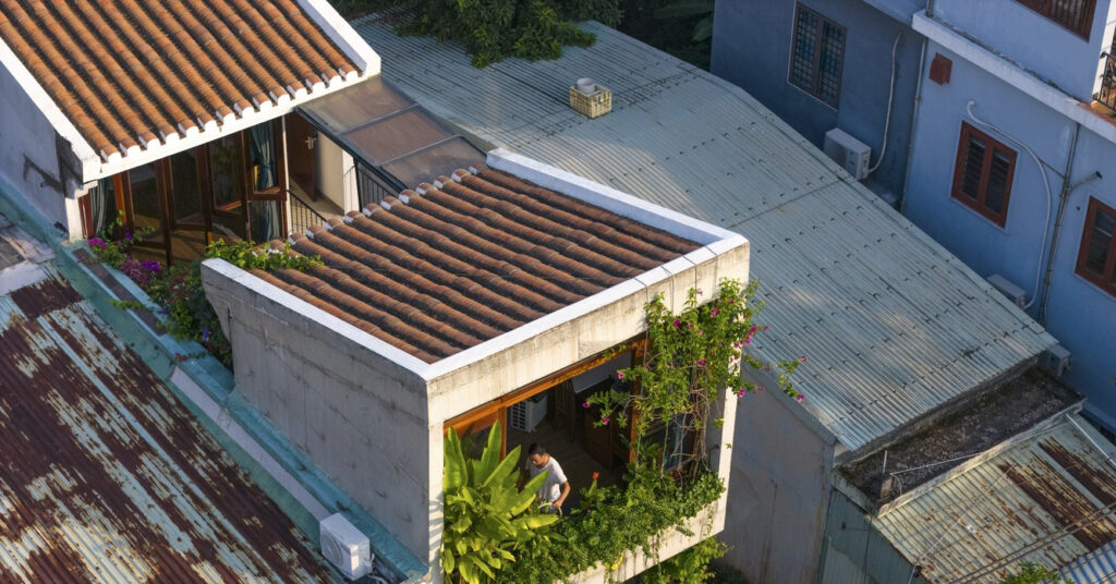 Giải pháp: Kiến trúc sư Ho Khue Architects tận dụng nửa diện tích phía sau để xây dựng ngôi nhà 3 tầng tối giản. Không gian phía trước biến thành một khu vườn cây xanh. Hệ thống bê tông cốt thép cách điệu lồng ghép một cách tự nhiên, giống như một vườn cây xanh trong nhà.