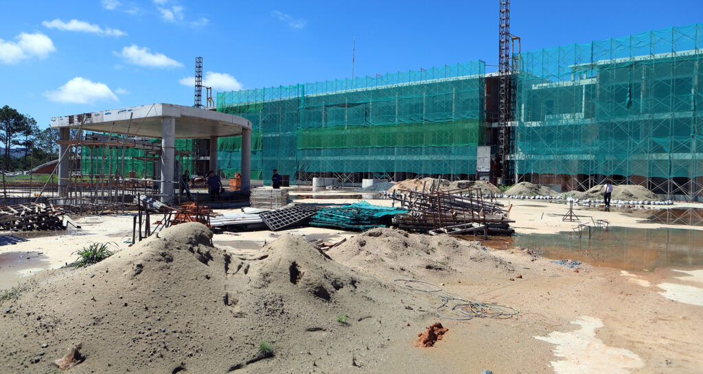 Trước khi bị tháo dỡ do bị phát hiện xây sai phép và trái phép, các hạng mục công trình bên trong dự án tòa nhà sân golf Đồi Cù Đà Lạt (tỉnh Lâm Đồng) dang dở, vật liệu xây dựng nằm ngổn ngang.
