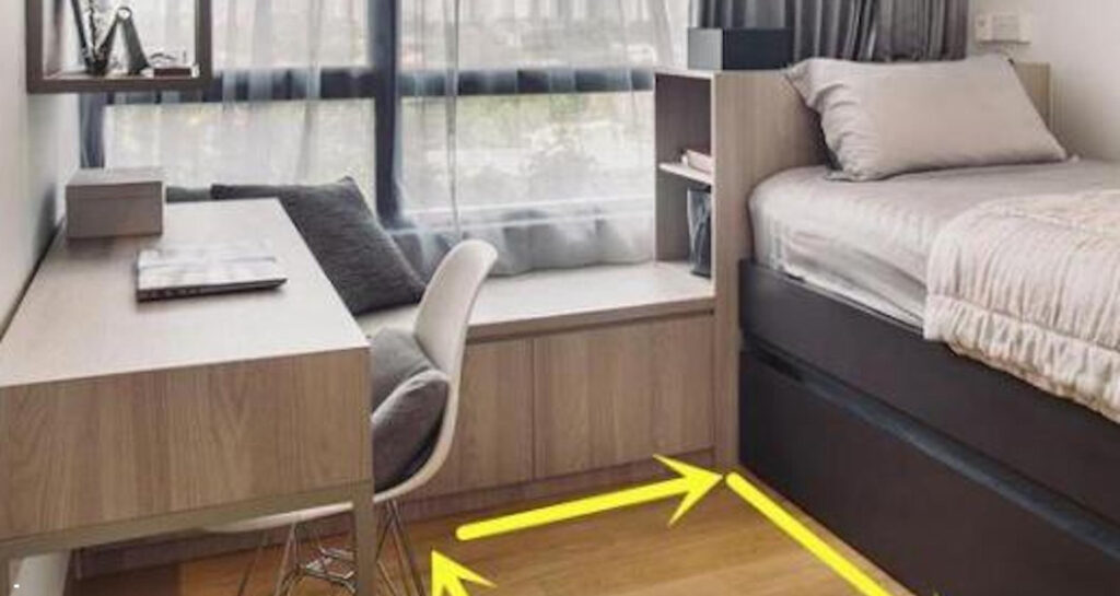 Cách bố trí giường theo kiểu truyền thống – đặt ở giữa phòng – thường không phù hợp với những căn phòng dưới 10m2. Thay vào đó, đặt giường sát tường hoặc kê vào góc sẽ giúp tối ưu diện tích.