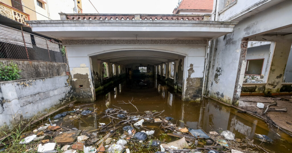 Bên trong một khách sạn bị bỏ hoang nhiều năm, lớp trần thạch cao bong tróc, có thể rơi xuống bất cứ lúc nào.