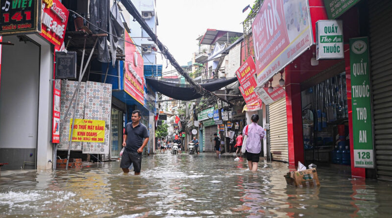 Trưa 1/10, dù trời đã tạnh mưa và hửng nắng, phố Triều Khúc, phường Thanh Liệt, Hà Nội vẫn ngập nghiêm trọng, nước ngang bắp chân, tràn vào nhiều nhà dân.