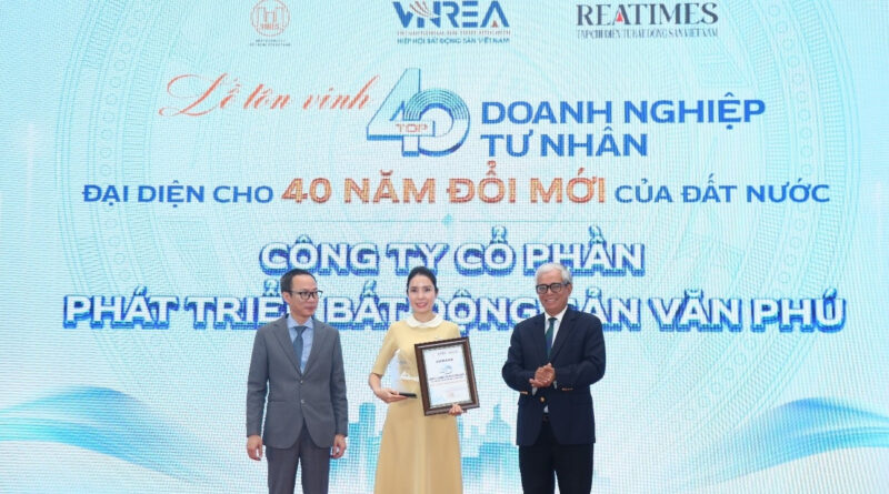 Ngày 8/10, tại lễ trao giải Top 40 doanh nghiệp tư nhân tiêu biểu do Tạp chí Bất động sản Việt Nam phối hợp Viện Nghiên cứu Bất động sản Việt Nam tổ chức, Công ty Cổ phần Phát triển Bất động sản Văn Phú đã được vinh danh, trao biểu trưng Top 40 doanh nghiệp tư nhân tiêu biểu đại diện cho 40 năm đổi mới của đất nước, đại diện cho tinh thần “nghĩ lớn – làm thật – cống hiến không ngừng”.