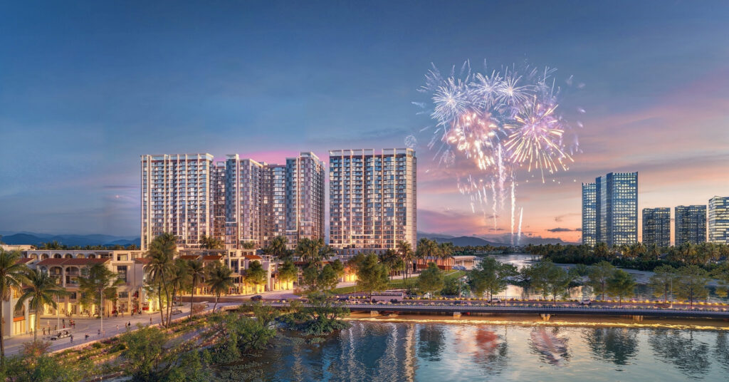 Ban ngày, cư dân được chiêu đãi thước phim đậm chất thơ của hai dòng sông uốn lượn trước khi đổ ra cửa biển. Tầm nhìn panorama 360 độ này mang đến sinh khí khoáng đạt và dòng chảy thịnh vượng cho gia chủ. Lăng kính từ ban công còn hướng thẳng xuống bức tranh sinh khí ngay dưới thềm nhà: nơi con trẻ thỏa thích tại công viên đa giác quan, người lớn thảnh thơi tại Clubhouse Onsen giữa thiên nhiên xanh mướt.